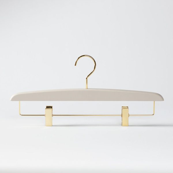 Laura cm 40×1,6 – beech wood hanger in stone gray / 10 gloss extra mat finish, style T brass hook and clips F